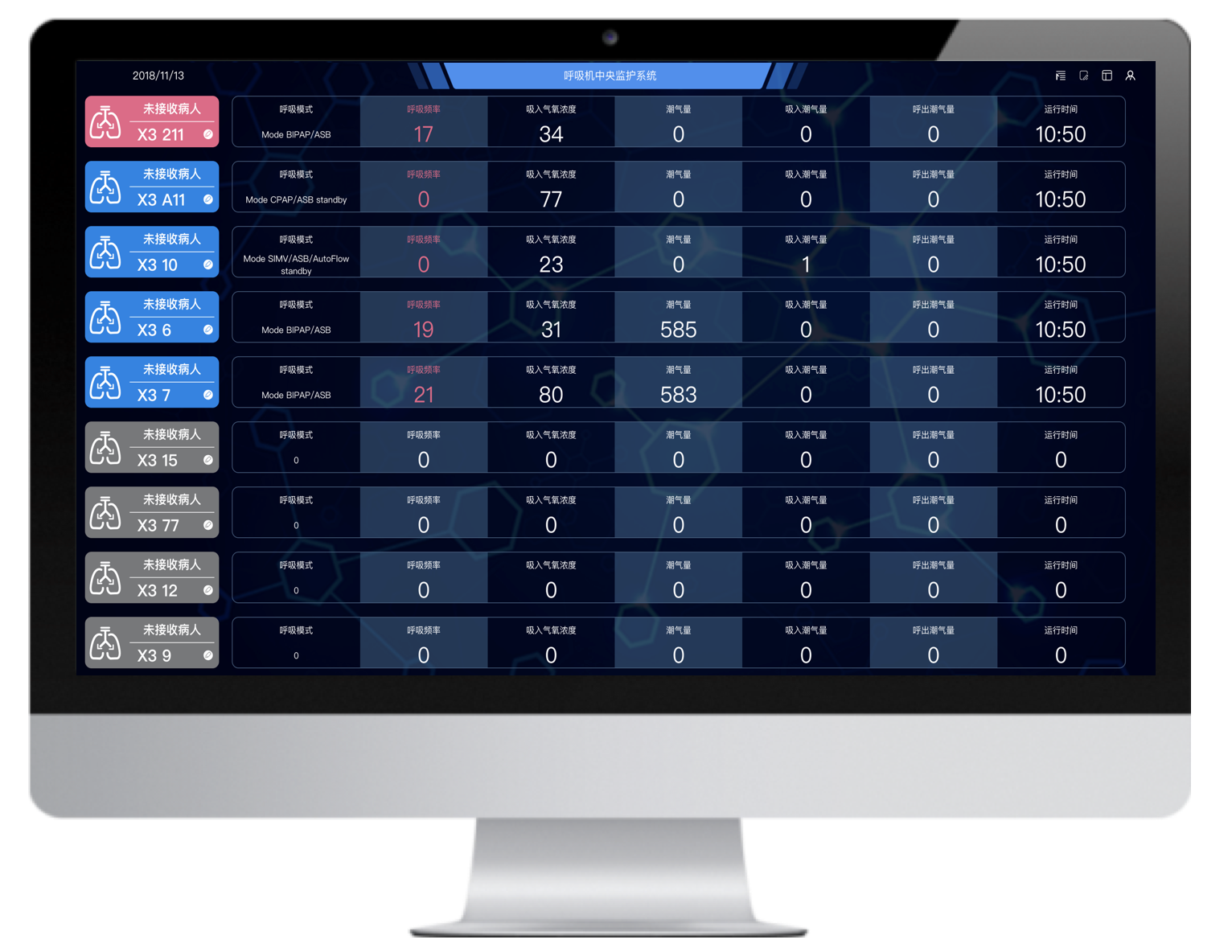 多臺不同品牌的有創(chuàng)呼吸機聯(lián)網,并通過大屏實時集中呈現(xiàn)治療預設參數和監(jiān)測參數,實現(xiàn)多臺集中監(jiān)測、集中管理和數據存儲。